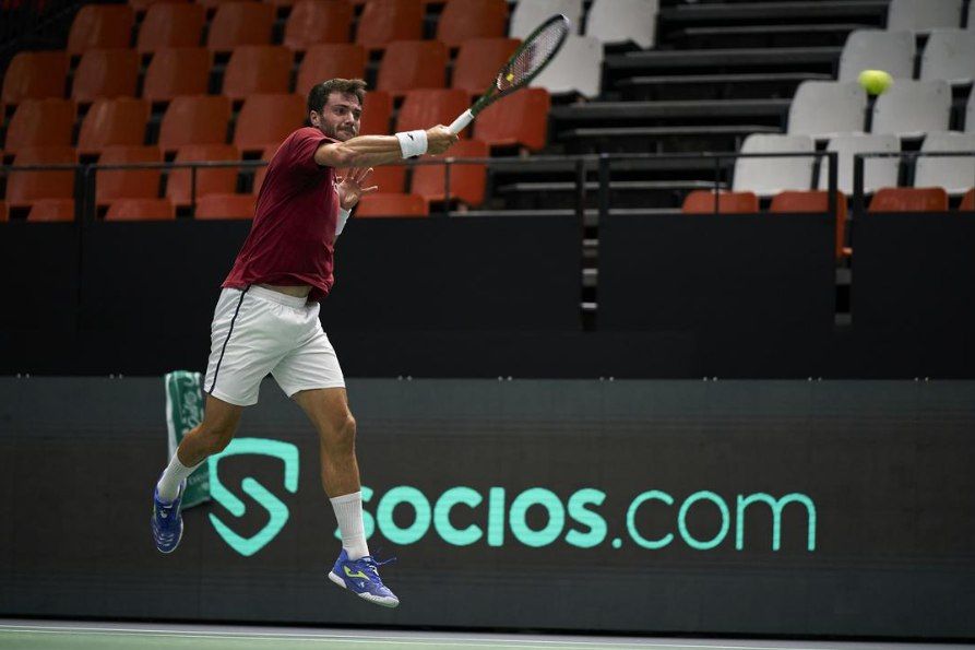 El encuentro comenzó de manera inmejorable para los intereses del tenista galo, que se colocaba break arriba nada más comenzar el choque. El español solo pudo hacer dos puntos en los primeros tres juegos y acabó pasándole factura en el set. Halys se distanció hasta el 4-1 cerrando todos sus saques sin perder un solo punto, algo que hacía imposible la remontada del valenciano. Además, con el 5-2 a su favor volvió a obtener otra rotura de saque que le otorgó la primera manga por un resultado de 6-2.